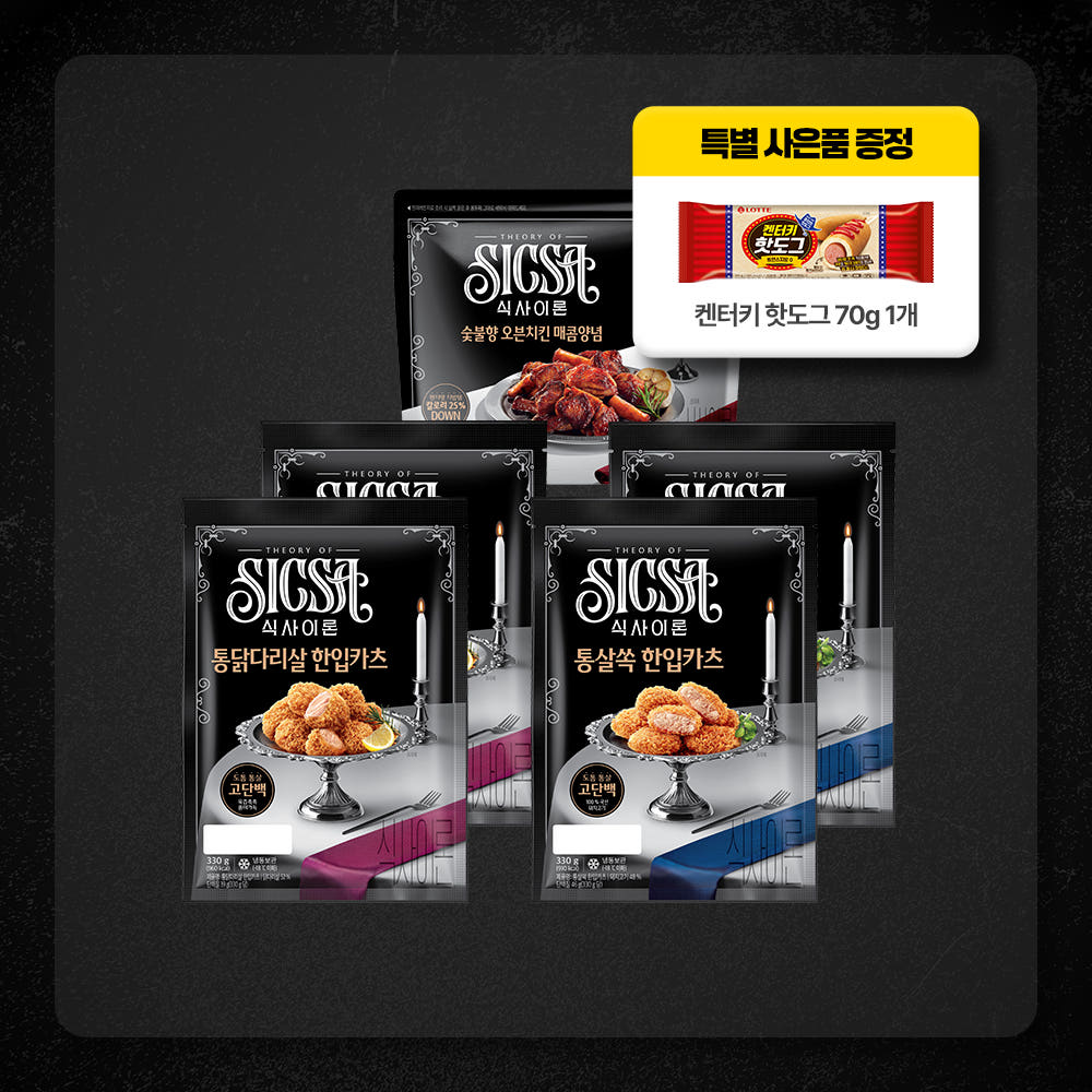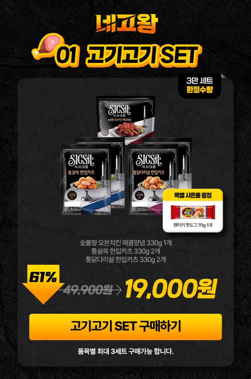 ✅ 네고왕 식사이론의 첫 번째 세트는 바로 고기러버를 위한 고기고기 세트입니다! 3만 세트 한정 수량으로 진행되는 요 세트는 숯불향 오븐치킨 매콤양념 330g 1개, 통살쏙 한입카츠 330g 2개, 통닭다리살 한입카츠 330g 2개로 구성되어 있는데요 😋 여기에 특별 사은품인 켄터키 핫도그 70g 1개가 추가된다고 합니다 🐷