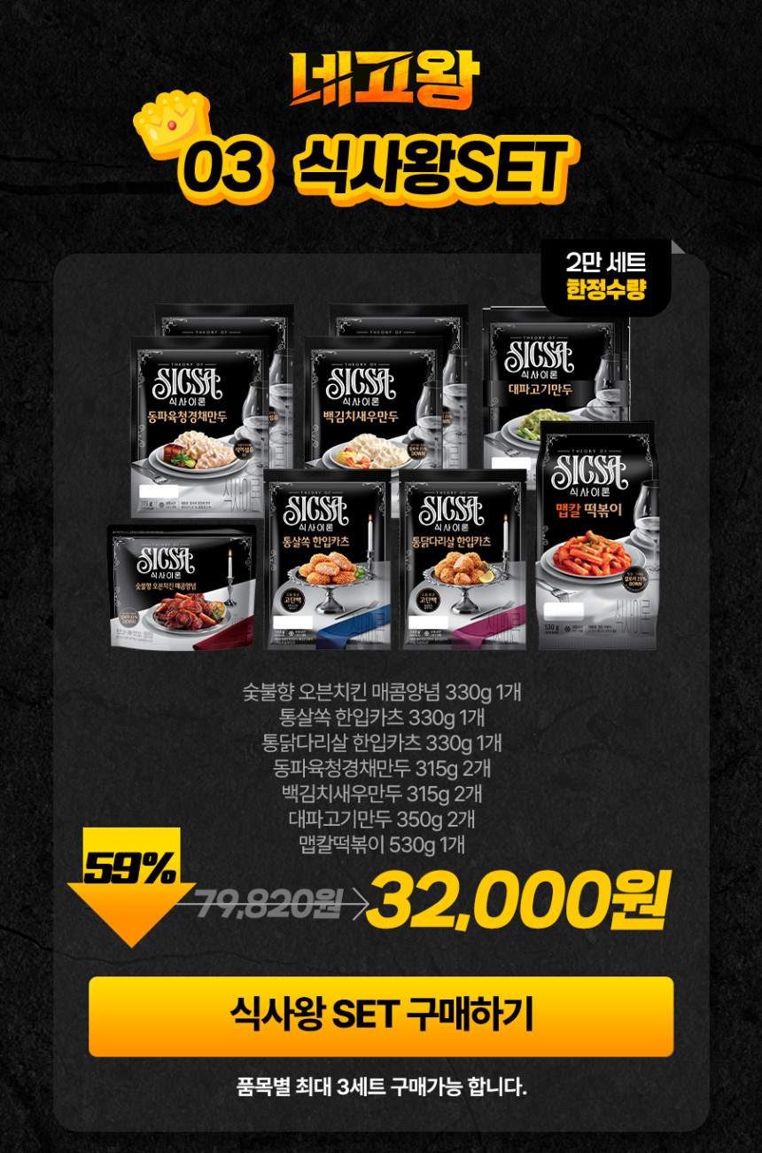 ✅ 네고왕 식사이론의 마지막 세트는 위의 두 가지를 골고루 즐길 수 있는 식사왕 세트입니다. 2만 세트 한정 수량으로 진행되는 마지막 세트는 숯불향 오븐치킨 매콤양념 330g 1개, 통살쏙 한입카츠 330g 1개, 통닭다리살 한입카츠 330g 1개, 동파육청경채만두 315g 2개, 백김치 새우만두 315g 2개, 대파고기만두 350g 2개, 맵칼떡볶이 530g 1개 구성으로 우리에게 낯선 브랜드인 식사이론의 상품을 다양하게 먹어 볼 수 있는 조합이네요 🤭