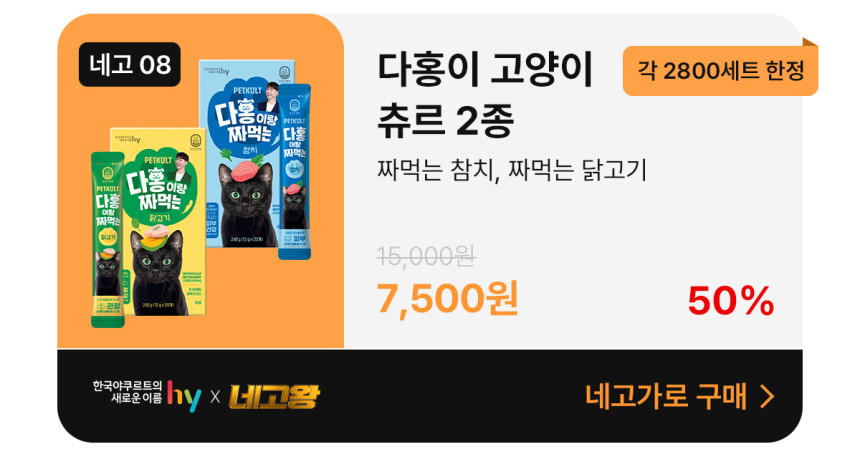 또, 하루야채와 야쿠르트는 젤리스틱과 에너지스틱으로도 판매되고 있었습니다. 마찬가지로 50% 할인되어 6,950원에 구매하실 수 있고, 강아지에게 왈이 있다면 고양이에게는 다홍이 고양이 츄르 2종이 있었는데 이 또한 50% 할인으로 7,500원 판매로 결정되었습니다. 마찬가지로 모델 박수홍 씨의 모델료 할인을 힘입게 되었습니다.