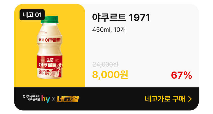 더 좋은 가격과 다양한 품목으로 돌아온 네고왕 야쿠르트, 이번 할인 행사를 놓치지 마시고 모두 합리적인 가격으로 건강 챙기시길 바랍니다!