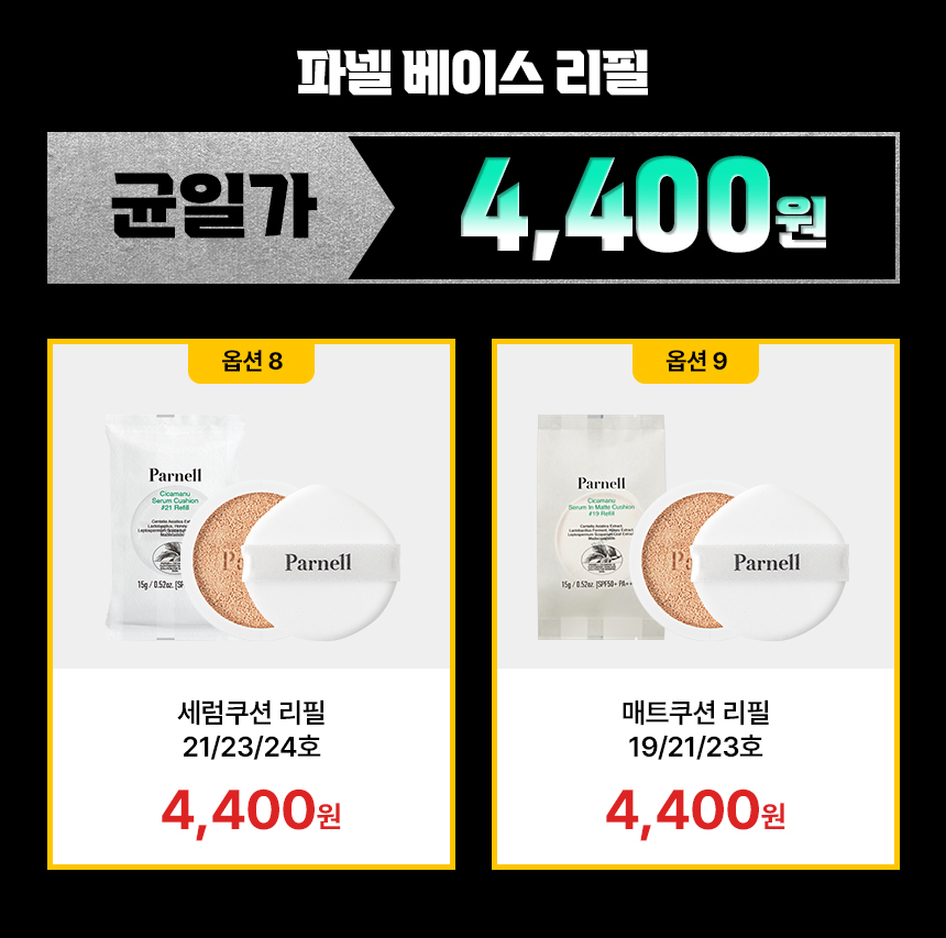 ✅ 네고왕 파넬의 두 번째 할인 라인업은 베이스 리필입니다. 본품만 살 수 없죠! 리필도 균일가 4,400원으로 판매하고 있습니다. 세럼 쿠션과 매트 쿠션을 구매하시는 분들은 리필 할인 혜택까지 놓치지 말아야겠죠? 😎