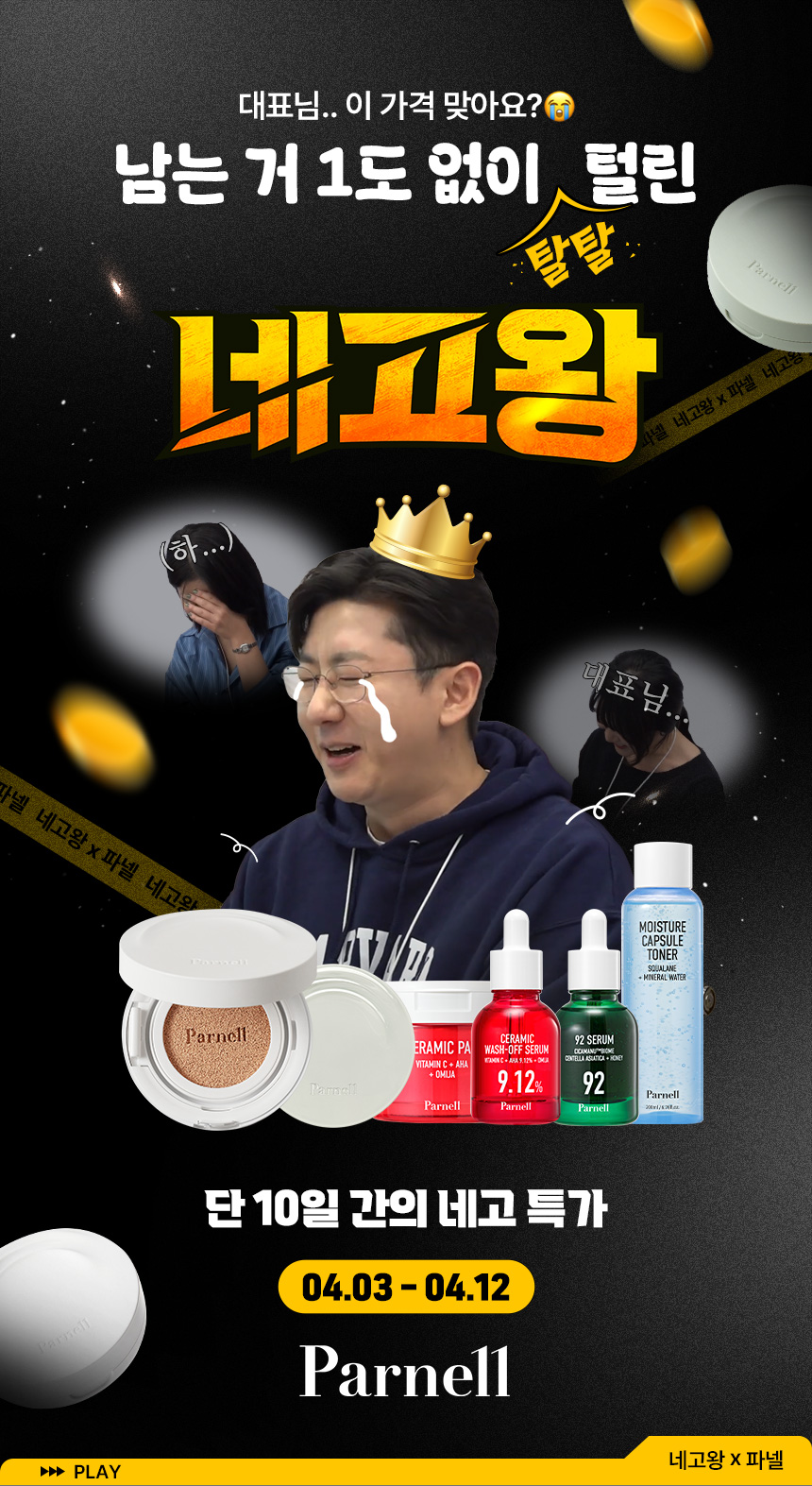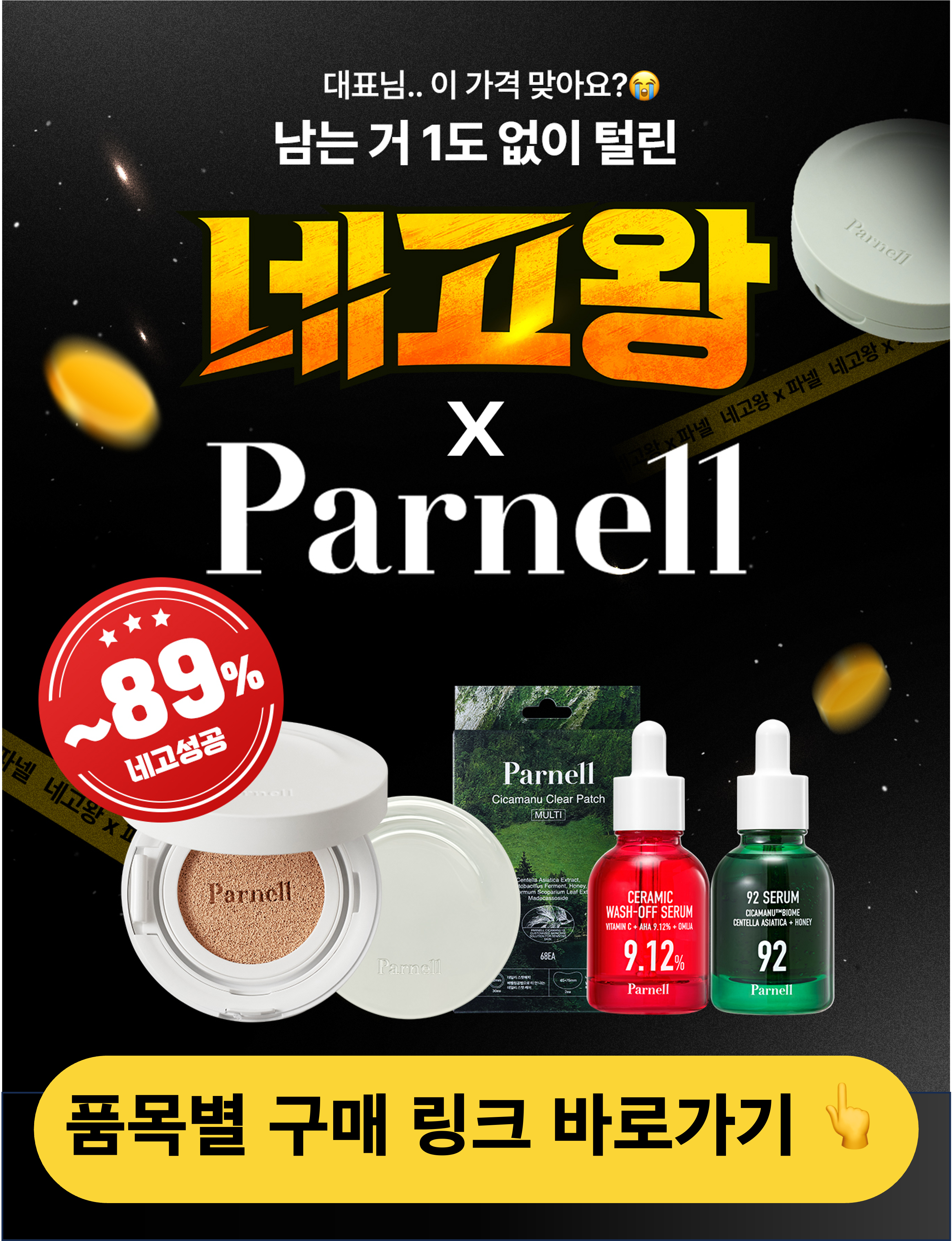 김원훈 님과 함께 진행하는 네고왕 시즌 7의 두 번째 품목은 바로 많은 분들이 원하시던 뷰티 제품이었습니다! 뷰티 제품인만큼 엄지윤 님도 지원 사격을 나셔 주셨는데요 👍 세럼과 쿠션은 물론 기초 화장품까지도 다양하게 갖추고 있는 파넬이 이번 두 번째 네고왕의 주인공이 되었는데요 🤭 최대 89%까지 역대급 할인이 진행되고 있으니 서두르세요 ❤️
