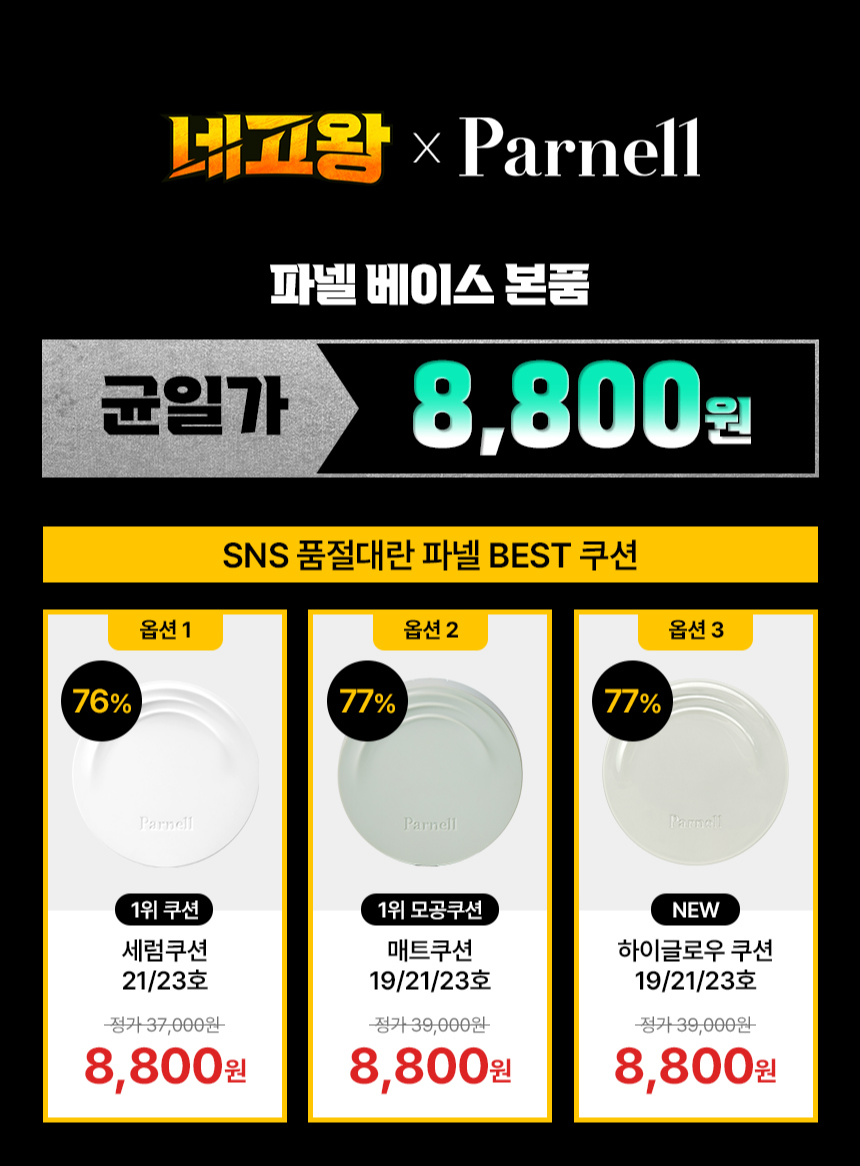 ✅ 오늘 네고왕 파넬에서 진행된 첫 번째 할인 라인업은 파넬 베이스 본품입니다. 각 단품을 균일가 8,800원으로 진행하게 되었는데요! 파넬의 대표 제품이라고 할 수 있는 세럼 쿠션, 매트 쿠션, 하이글로우 쿠션과 스킨 핏 파운데이션, 하이글로우 세럼 파운데이션, 매트 스펀데이션, 액체형 노세범 쿠션이 균일가 8,800원으로 구매 가능합니다!