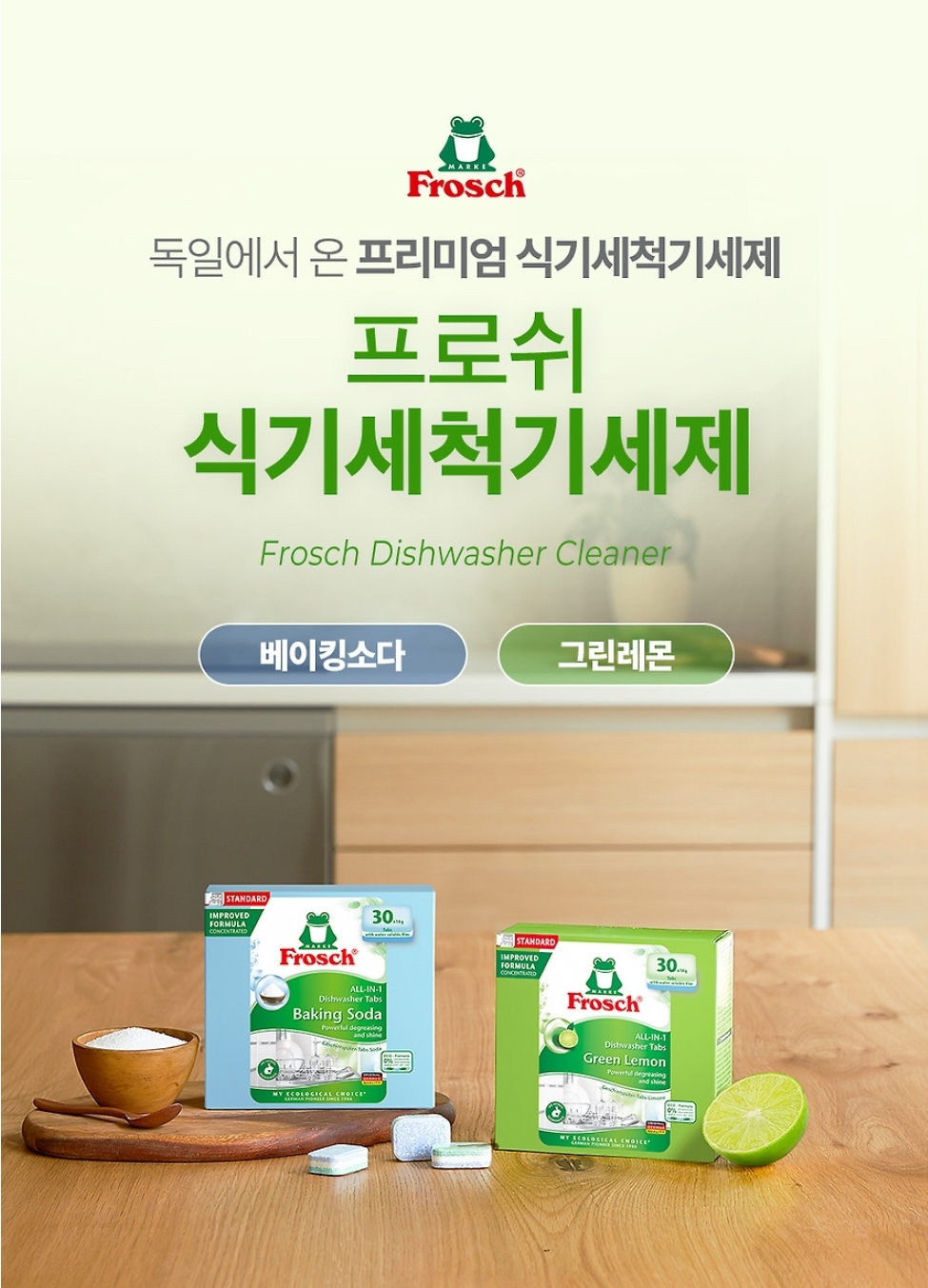 ✅ 네 번째는 프로쉬의 인기 상품이죠! 식기세척기 세제입니다. 역시나 순한 성분으로 안심하고 사용할 수 있는 제품으로 유명하고, 특히 아무 광고나 하지 않으신다는 김혜자 님의 광고로 더 유명해진 것 같아요. 베이킹소다, 그린레몬 2가지 종류가 준비되어 있습니다.