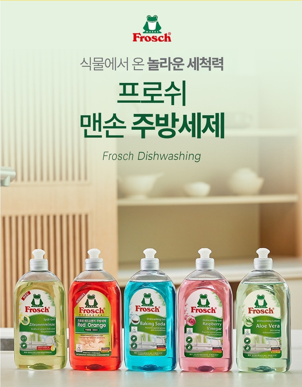 ✅ 다섯 번째로는 맨손 사용에도 안심! 손이 아리거나 건조해지지 않는 프로쉬의 또다른 대표 상품인 주방 세제입니다. 개당 500ml로 넉넉한 용량에 은은한 원료의 향이 그대로 묻어 나오는 베이킹소다, 라즈베리, 알로에베라, 레드오렌지, 레몬민트 5가지 타입으로 준비되어 있고요. 이번 네고에는 포함되어 있지 않지만 아이를 위한 주방 세제도 따로 있다고 합니다.