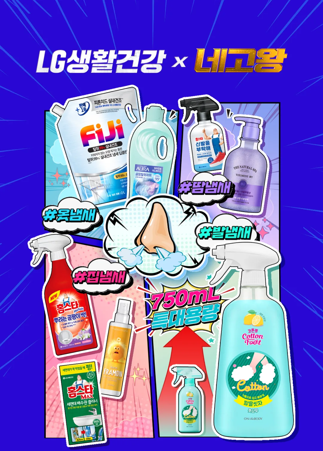 네고왕에서 세 번째로 진행하는 LG생활건강 네고! 이번에는 여름철을 대비하여 땀냄새, 발냄새 등을 잡을 수 있는 상품과 옷냄새, 집냄새 등 생활 악취를 잡을 수 있는 세탁 세제, 섬유 유연제, 섬유 탈취제 등 다양한 탈취 용품을 마련하였습니다. 특히 발을 씻자가 이번 네고를 맞이하여 대용량과 리필용으로 새로이 출시되어 더 관심을 끌고 있습니다.