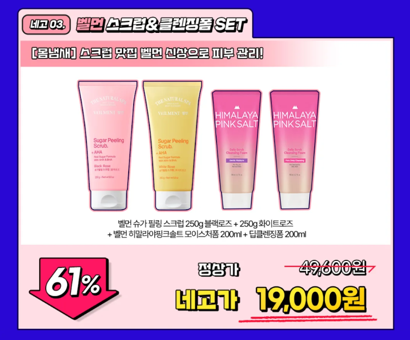 세 번째로는 신상품인데요. MZ 사원이 소개했다고 해서 할인이 더 들어갔습니다 ✨✨ 스크럽과 클렌징폼 세트로 이번에는 얼굴에 사용할 수 있는 라인이 추가로 나왔습니다. 필링 스크럽 250g 블랙로즈와 화이트 로즈, 그리고 히말라야핑크솔트 모이스처폼 200ml와 딥클렌징폼 200ml로 구성되어 정가 49,600원에서 무려 61%를 할인하여 19,000원에 판매됩니다.