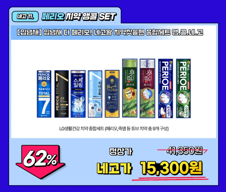 기타 제품으로는 지난 번에 진행했던 치약 세트가 앵콜로 돌아왔습니다. 페리오, 죽염, 프로폴리스 등 튜브 치약을 다양하게 구성하여 총 9개를 정가 41,350원에서 62% 할인하여 15,300원에 판매합니다. 그외는 특별히 광고하길 원하셨던 피지오겔 DMT 젤 크림 70ml 2개 세트로, 끈적거리지도 않으면서 속수분을 채워주는 게 특징이라고 합니다. 정가 59,000원이지만 62% 할인하여 22,000원에 판매됩니다.