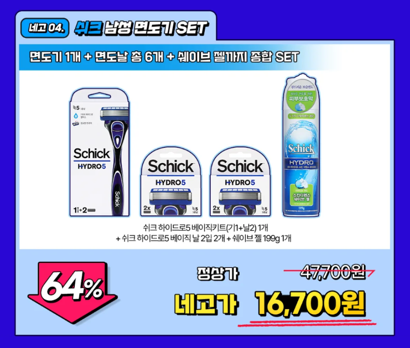 여름철을 앞두고 준비한 네고인만큼 남성, 여성 면도·제모기도 라인업에 포함되었습니다. 먼저 쉬크 남성 면도기가 날 2개를 포함한 본품에 날 2입 2개를 추가하여 쉐이브 젤까지 세트 구성을 이루게 되었는데요. 정가 47,700원이지만 64% 할인하여 단돈 16,700원에 판매됩니다.