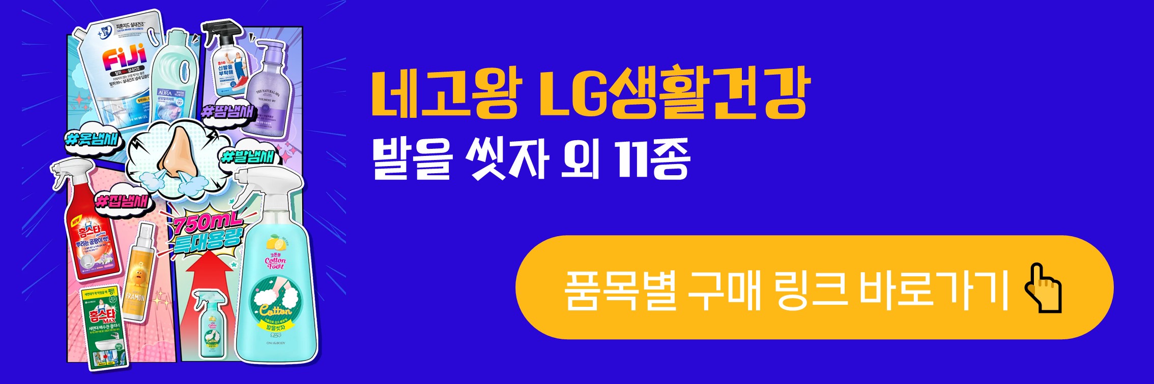 | 네고왕에서 세 번째 LG생활건강 네고를 진행합니다! 생활 필수품이 되어버린 발을 씻자부터 여름철 악취 대비 탈취 용품 12종 모두 ✨ 최대 70% 할인가로 구매하세요 💸💸 |