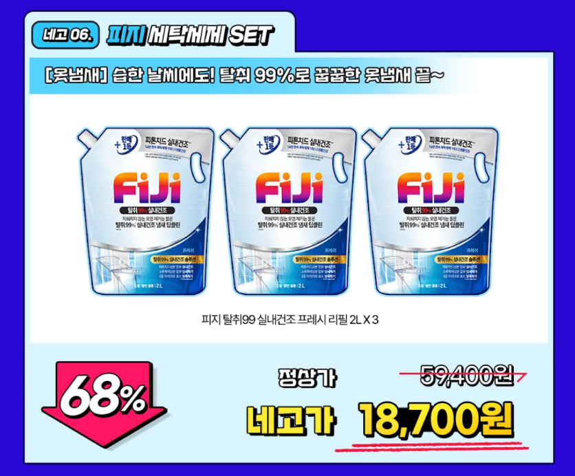 먼저 여름철 빨래 실내 건조에도 꿉꿉함을 제거하는 피지 세탁세제 세트입니다. 얼룩 제거는 물론 탈취 99% 효과로 건조하는 중에도 실내에서도 깨끗함이 느껴진다고 합니다. 리필용 2L 3개를 세트로 정가 59,400원이지만 68% 할인하여 18,700원에 판매됩니다.