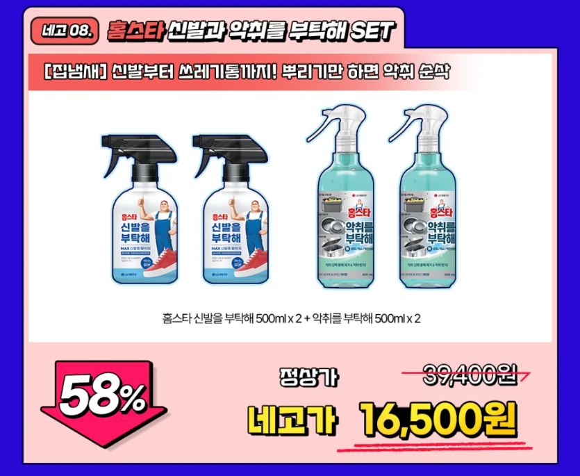 이밖에도 신발을 포함한 악취를 제거하는 탈취제 신발을 부탁해 500ml 2개와 악취를 부탁해 500ml 2개가 세트 구성으로 정가 39,400원에서 58% 할인되어 16,500원으로 결정되었습니다. 홈스타 시리즈의 대표 제품 또한 라인업에 올랐는데요 🧽🧽 욕실용 세정제 500ml 2개와 뿌리는 곰팡이 싹 500ml, 바르는 곰팡이 싹 120ml, 그리고 세면대 배수관 클리너까지 5개 세트가 정가 25,000원에서 50% 할인으로 12,300원에 판매됩니다.