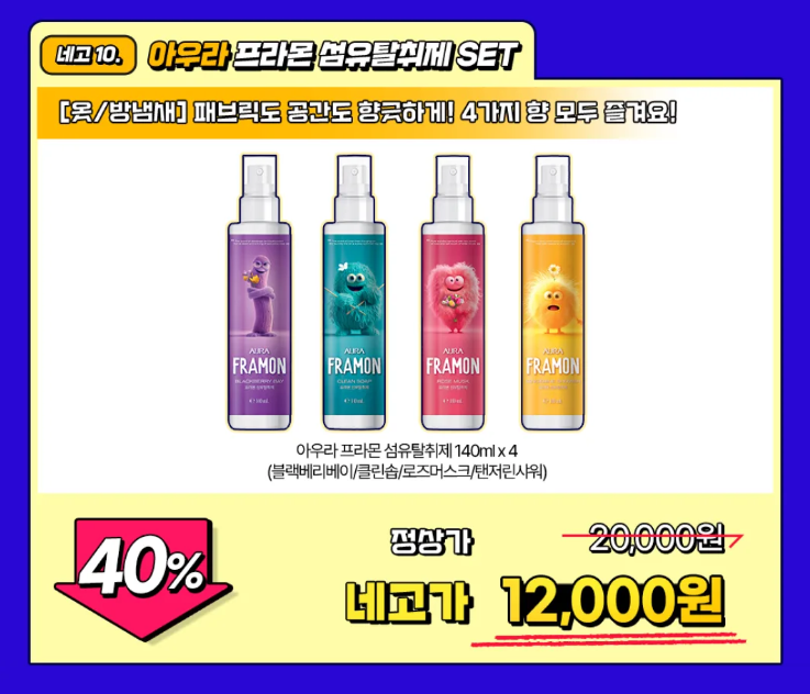 또한 일반 옷에 뿌릴 수 있는 아우라 프라몬 섬유탈취제 140ml가 4개 세트 구성으로 나왔는데요. 귀여운 몬스터가 그려진 컬러별 패키지가 눈에 띕니다. 로즈머스크, 탠저린샤워, 블랙베리베이, 클린솝 4가지 향 모두 경험하실 수 있도록 구성되어 있고, 섬유 외의 침구나 옷장, 화장실에도 사용 가능합니다. 정가 20,000원에서 40% 할인되어 12,000원에 판매됩니다.