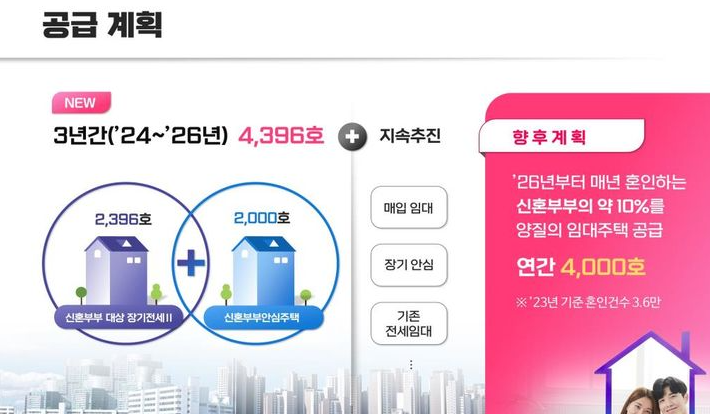 29일 오전 오세훈 서울시장이 서울시 브리핑을 통해 ‘저출생 대응 신혼부부 주택 확대방안’을 발표하였습니다. 이는 올해 2024년부터 2026년까지 서울시가 3년 동안 신혼부부에게 공공주택 4,396호를 공급하고, 이후부터는 매년 신혼부부의 10%에게 공공주택을 공급한다는 내용이었습니다. 저출산이 사회 문제가 되는 시기인만큼 이에 대응하기 위한 새로운 방안을 내세운 것으로 보입니다.