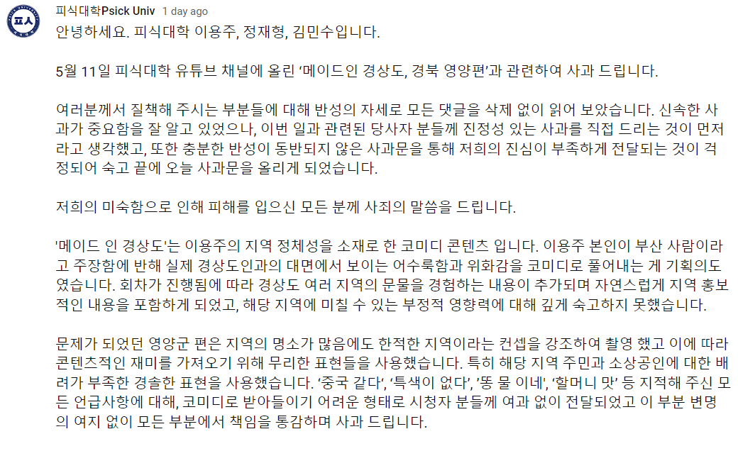 이에 많은 구독자들과 영상을 본 시청자들이 사과를 요구했지만, 피식대학은 뒤늦은 대응으로 많은 사람들을 실망시키고 논란에 이르렀습니다. 결국 일주일이 지난 18일 이들은 "5월 11일 피식대학 유튜브 채널에 올린 ‘메이드인 경상도, 경북 영양편’과 관련하여 사과 드립니다."라는 사과문과 함께 해당 영상을 비공개 처리하였습니다.