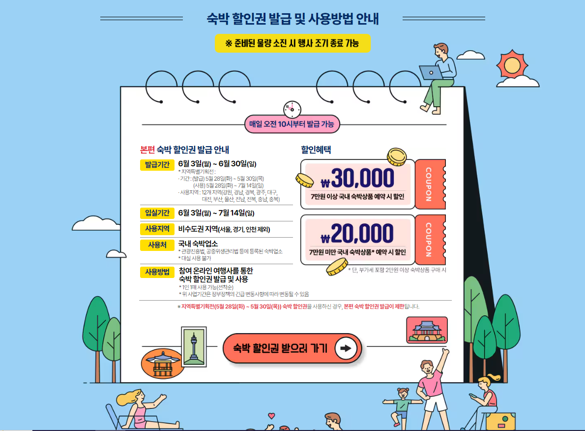 여행 가는 달인 6월을 맞이하여 올해도 어김없이 숙박 대전, 즉 숙박 세일 페스타가 시작되었습니다. 문화체육관광부와 한국관광공사가 함께하는 이번 할인 행사는 6월 3일부터 6월 30일까지 서울, 경기, 인천을 제외한 비수도권 지역의 숙박비에 3만원 할인 쿠폰을 발급해 주는 내용을 골자로 합니다. 7월 14일까지 이용 가능하니 꼭 확인하셔서 여름 휴가에 보태시기 바랍니다! 🙌