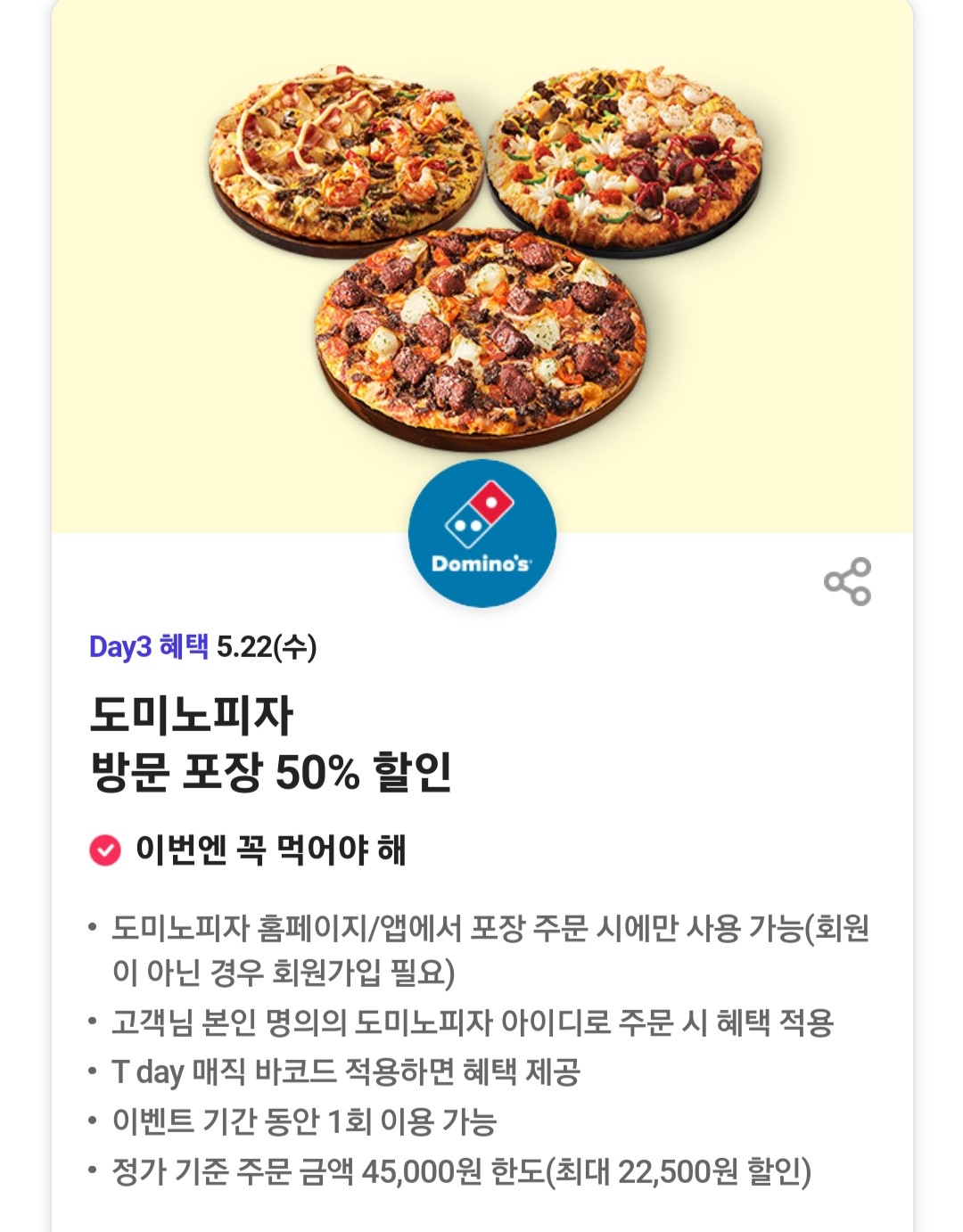5월 티데이 도미노 피자 방문 포장 50% 할인