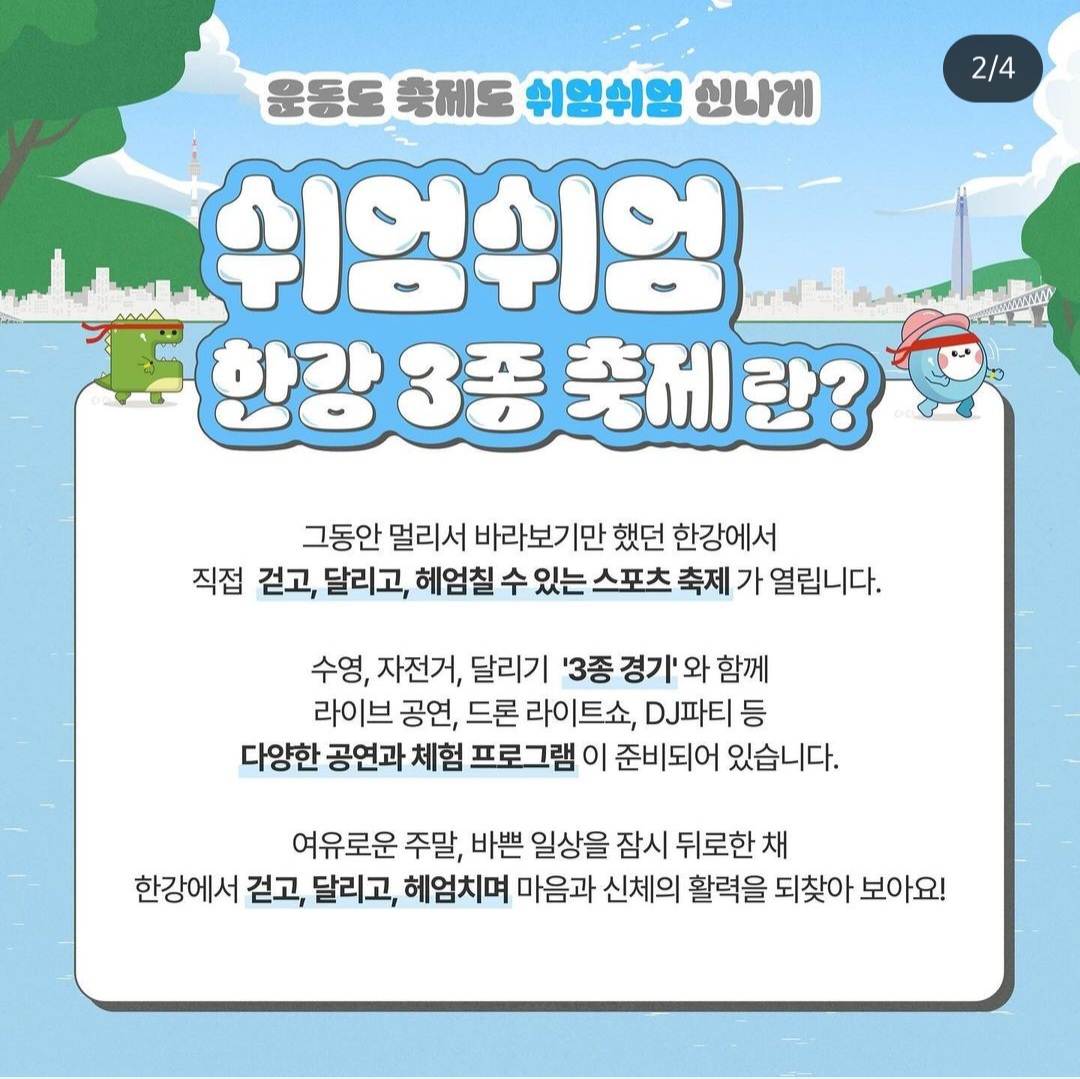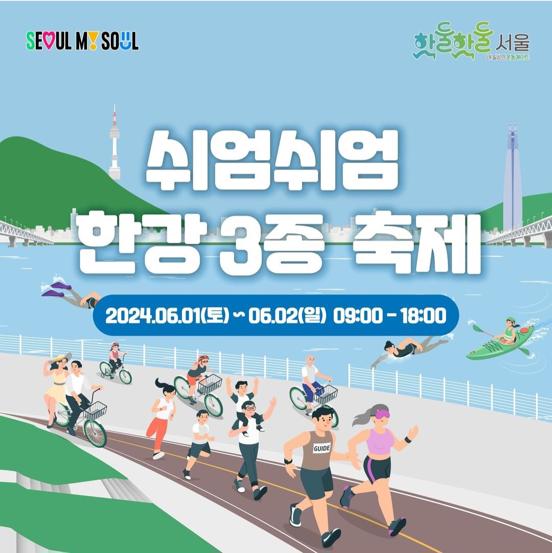 이번 6월 축제인 쉬엄쉬엄 한강축제를 앞두고 김영환 서울시 관광체육국장은 “강인하게 훈련된 사람만이 참가할 수 있는 ‘철인 3종 경기’와 달리 ‘쉬엄쉬엄 한강 3종 경기’는 누구나 도전하고 싶고, 도전할 수 있는 모두의 생활체육축제로 준비했다”며 “한강을 새롭게 즐기는 축제에 많은 시민의 참여를 바란다”고 말했습니다. 많은 시민들이 제한 없이 한강을 누리고 즐기는 시간이 되었으면 좋겠습니다.