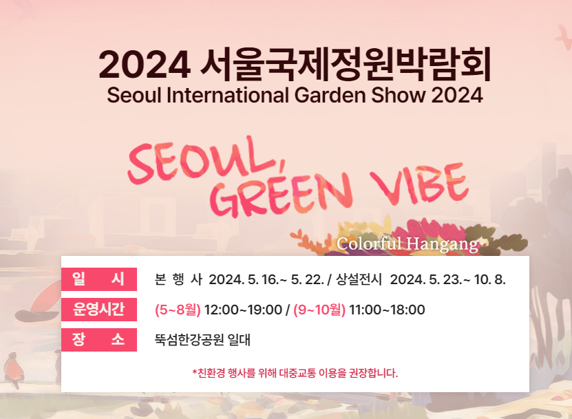참가 신청을 놓쳤어도 뚝섬한강공원 전반에서 버스킹 공연인 구석구석 라이브와 태권도 시범 공연, 뮤지컬 공연 등 다양한 문화 및 예술 프로그램을 진행할 예정이라고 하니 가족이나 지인과 함께 즐길 수 있습니다. 또, 뚝섬한강공원에서 5월 23일부터 상설 전시로 전환된 서울국제정원박람회 역시 진행 중이니 함께 구경해 볼 수 있습니다.