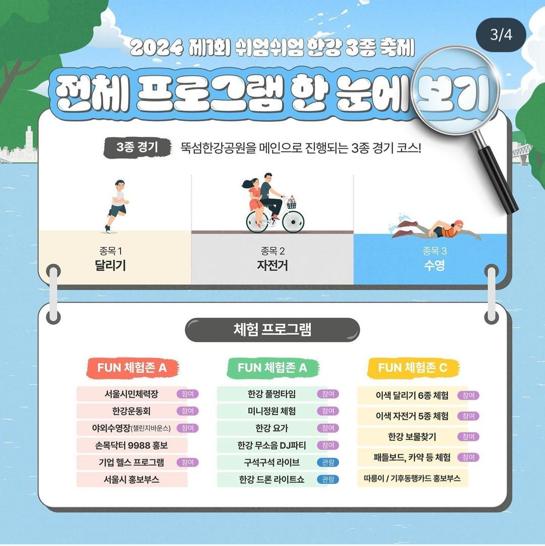 - 내용: 신청자 각자의 체력에 따라 코스를 선택하고, 자신의 속도와 방식에 맞게 수영, 자전거, 달리기 3가지 종목을 완주하는 프로그램