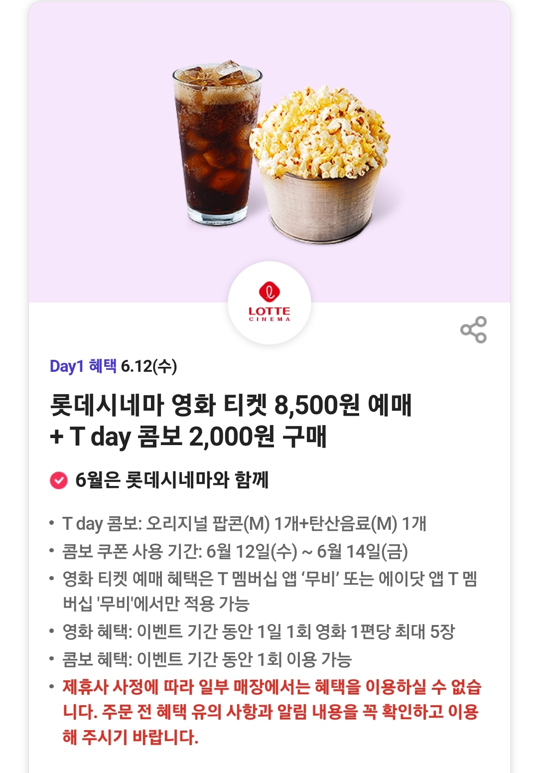 6월 티데이 롯데시네마 8,500원 영화 티켓 예매 및 2,000원 Tday 콤보 구매