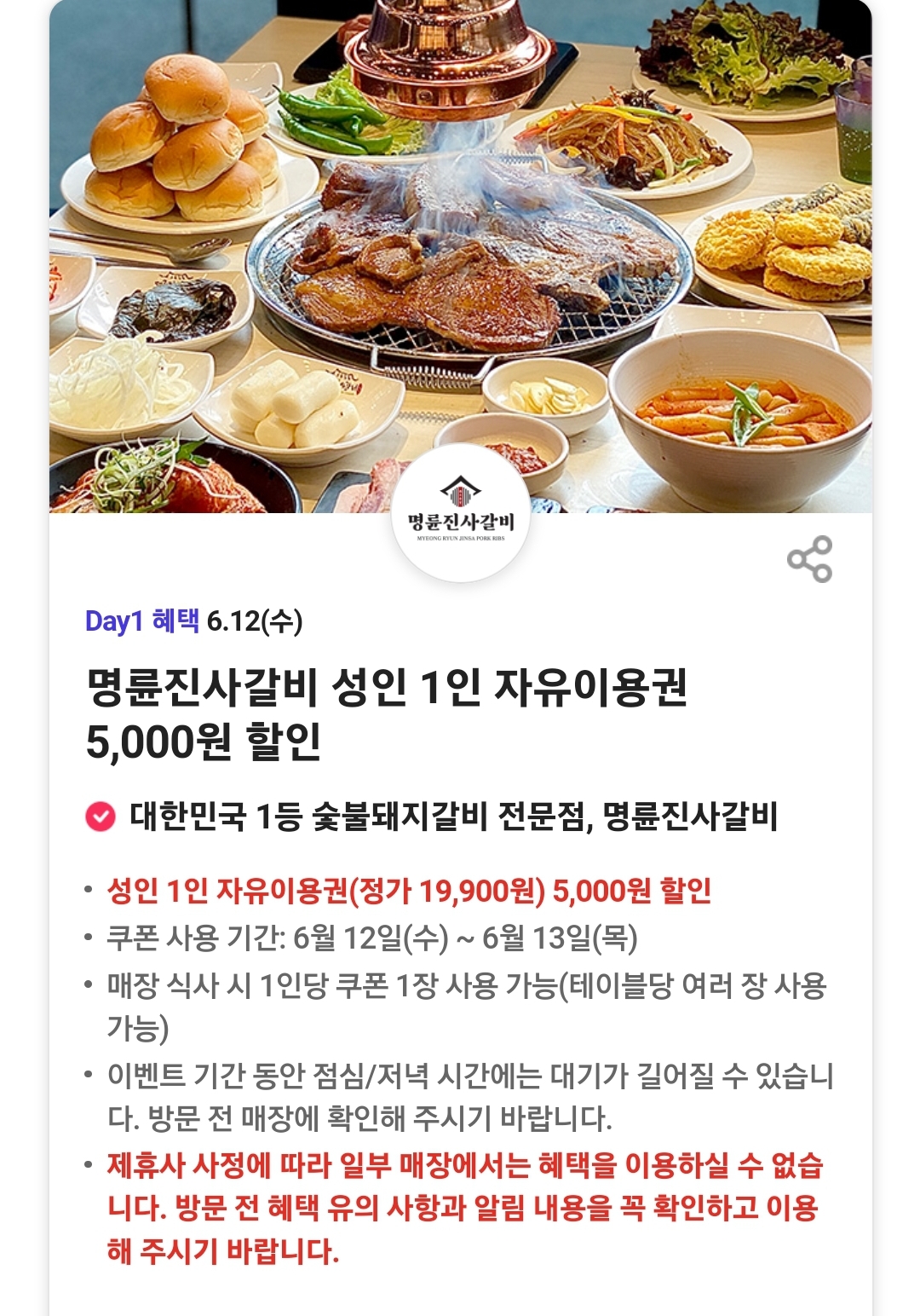 6월 티데이 명륜진사갈비 1인 5,000원 할인